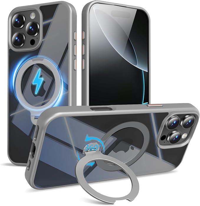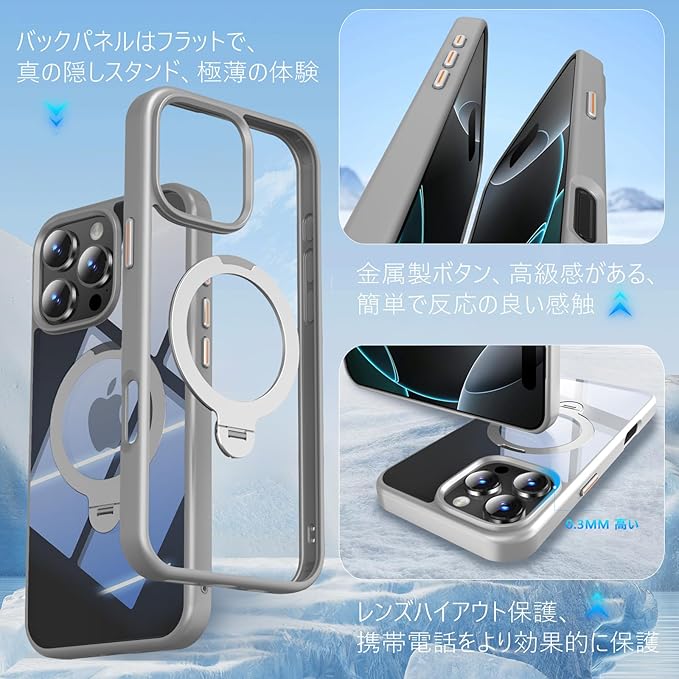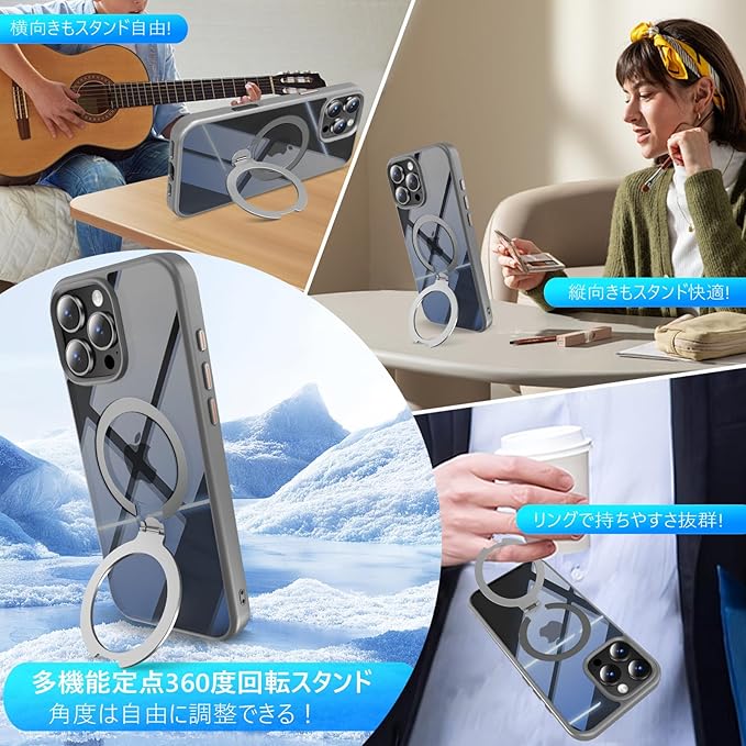 KWATUNG いphone16promax用 ケース magsafe対応 多機能定点360度回転 スタンド付き 縦横両対応 iphone16promax用 ケース リング付き マグセーフ ワイヤレス充電 耐衝撃 米軍MIL規格 全面保護 アイフォン16プロマックス用 スマホケース マグネット搭載 隠し収納式 ストラップホール付き 6.9インチ 透明 クリアの背面【グレー】