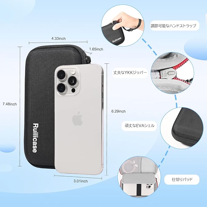【持ち便利】この保護ケースのサイズは18.5 9.5 3.2cmです。軽量設計で持ち運びに便利で、バッグの中に収納しても場所を取りません。ファスナー式の開閉構造になっているため、スマホの出し入れがスムーズで、急いで使用する場合でも手間を省けます。この保護ケースは旅行、出張、通勤など、様々なシーンでの機器の持ち運びに最適です。