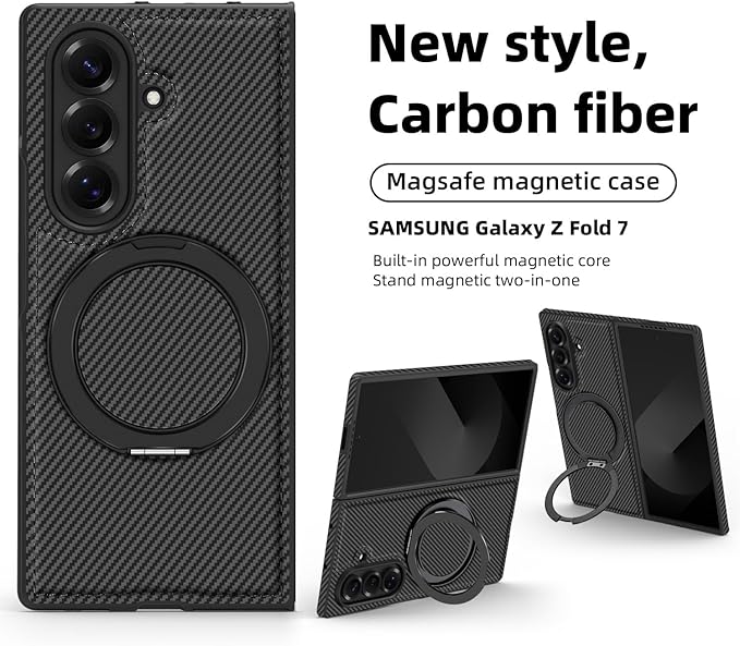 携帯スマホケース Galaxy Z Fold7用 360 カーボン 回転マグネティックスタンド付 多機能統合型 薄型 軽量 ワイヤレス充電対応 独立ボタン カバー TPU 折り畳み 滑り防止 全面保護 複合構造 レンズ保護 指紋防止 ソフト 人気 可愛い 面白い 耐衝撃 Beautycatcher - 黒