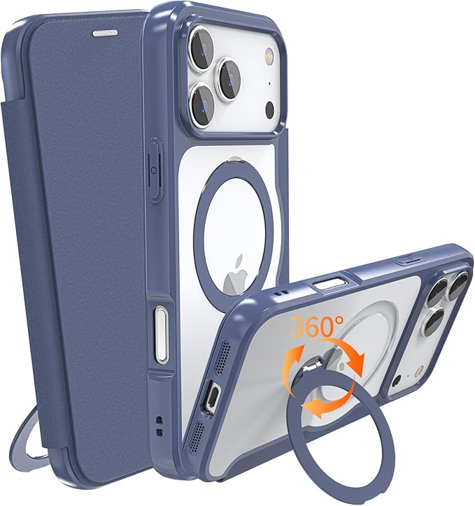 iPhone 17 Pro Max 用 ケース 手帳型 カード収納 背面クリア MagSafe対応 リング付き 360 回転スタンド軽い 薄型 耐衝撃 全面保護 縦横両対応 レザー素材 マグセーフ対応 おしゃれ 青