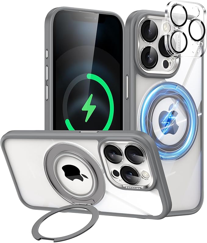 iPhone 15 ProMax用ケース MagSafe対応 360 回転リングスタンド付き マグネット強い磁気 クリア背面 シリコン縁耐衝撃 薄型 かわいい 取り外し可能のカメラカバー 4K HDガラスフィルムレンズ全面保護 ワイヤレス充電対応 オシャレなアイホン15プロマックスケース グレー