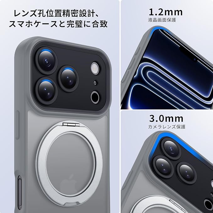 Aunote iPhone 17 Pro Max ケース 精密カメラ保護 360 回転スタンド MagSafe対応 薄型 軽量 米軍MIL規格 耐衝撃 黄変防止 スマホケース いphone17promax ケース カバー グレー