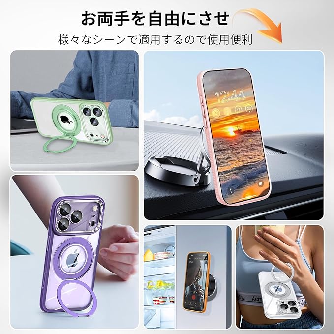 【マグネット搭載で強力な磁力吸着】ケースのスタンドに強力なN52マグネットを搭載し、マグセーフ対応の様々なアクセサリーを適用します。MagSafe対応の充電器や車載ホルダー、あらゆる充電に安定で接着ができ、料理中に冷蔵庫に吸い込むことができ、映画を見たりしてご家族のお召しを作ったりするのは楽しいでしょう!