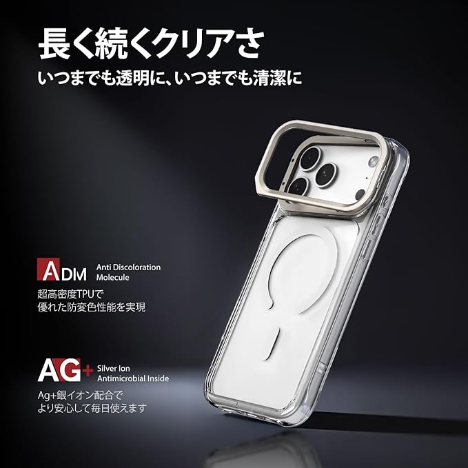 【より長く透明でいよう】 黄変耐性の高いADM(anti-discoloration molecule) と抗菌効果のあるAg+銀イオンがTPUに含有されているので、LINKASE AIRは、より長く透明に、より安全に細菌から保護された状態を保つことができます。※全ての細菌に効果があるわけではありません。