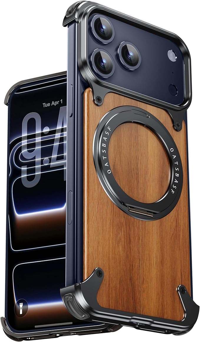 OATSBASF iPhone 17 Pro Max用バンパーケーススリムなミニマルデザイン、耐衝撃・防護機能付き、航空機級素材のシェル 360 回転式キックスタンド 、ウッド-ブラック
