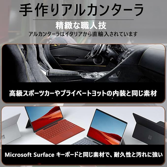 【Alcantara(アルカンターラ)正規素材】イタリア Alcantara 正規素材を使用。高級車内装にも採用される上質な手触りと、落ち着いた高級感をスマホでも楽しめます。
