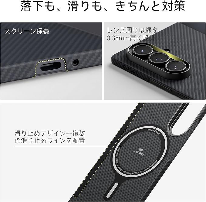 【0.96mm薄さ-ストレスフリーな使い心地】厚さわずか0.96mm、重さ約21.2gの超スリム設計。アラミド繊維は軽量でありながら高い強度を持ち、鉄のような強靭さを誇りますが、その重量はわずか四分の一程度です。長時間スマホを手にしていても手が疲れにくく、日常使いに最適。ミニマルなデザインがスマートフォンの美しさをそのまま引き立てつつ、しっかりと保護してくれます。ポケットやバッグの中でもかさばらず、快適な携帯性を実現します。