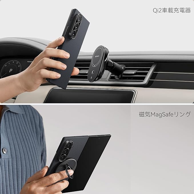 【MagSafeに対応、置くだけピッタリくっつける】超強力なマグネットが内蔵され、MagSafeにぴったり対応。Galaxy Z Fold 7本体をMagSafeアクセサリー接続で便利にお使いいただけます。またPITAKAのスマホリングMagEZ Grip3や、NFC対応Qi2.0車載充電器MagEZ Car Muont Pro2 Qi2に最適です。