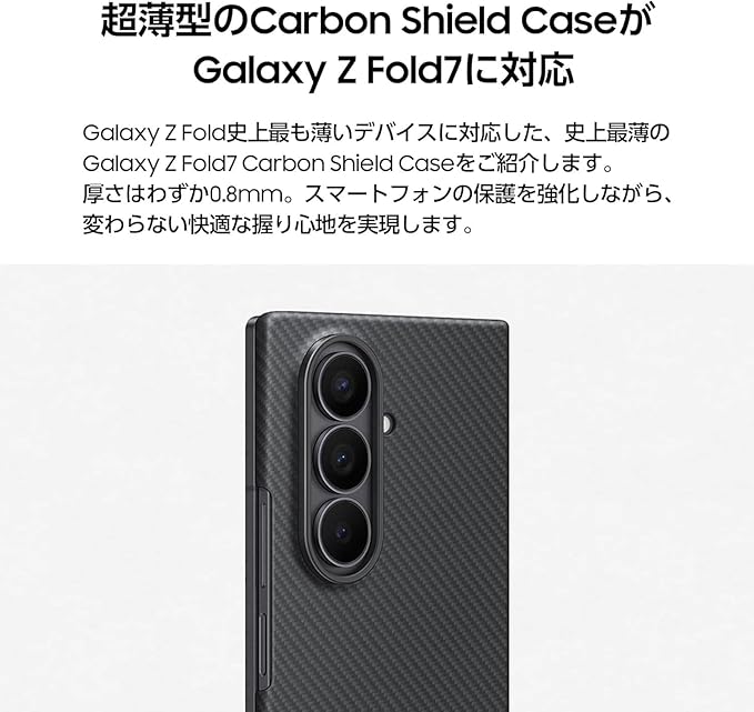 ・超薄型のCarbon Shield Caseが Galaxy Z Fold7に対応。Galaxy Z Fold史上最も薄いデバイスに対応した、史上最薄のGalaxy Z Fold7 Carbon Shield Caseをご紹介します。厚さはわずか0.8mm。スマートフォンの保護を強化しながら、変わらない快適な握り心地を実現します。 ・なめらかな質感でカーボンならではの 洗練されたスリムなケース。紙のように薄いフレームが持つ、驚きの強度をご覧ください。丈夫な炭素合成繊維アラミドを使用したGalaxy Z Fold7 Carbon Shield Caseは、傷や見た目の変化に強くなっています。 ・滑らかな手触りで クリアに保護。Galaxy Z Fold7 Carbon Shield Caseには、タッチへの応答性を維持しながら強度を高める前面用のAnti-reflecting Filmが2枚同梱されています。Galaxy Z Fold7 Carbon Shield Caseは背面をカバーし、スマートフォンの保護を強化して日常的な摩耗から守ります。