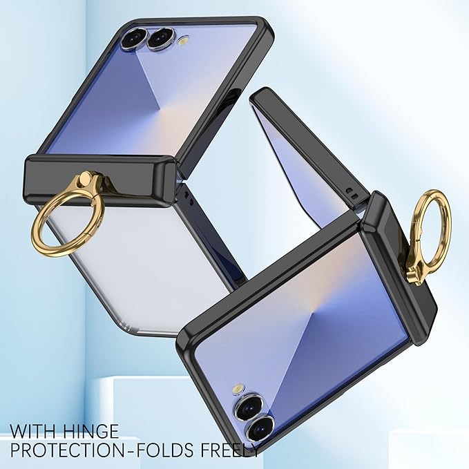 携帯ケース Galaxy Z Flip7専用手帳型透明軽量 薄型 3Dメッキ フレーム 金具リングスタンド付 ヒンジ保護 360度防護 衝撃吸収 カバー ワイヤレス充電対応 レンズ保護 キラキラ 折り畳み フリップ 滑り防止 スマホ 人気 反塵 個性 ユニーク 豪華 可愛い 面白い おしゃれ 二層構造 - Beautycatcher - 黒