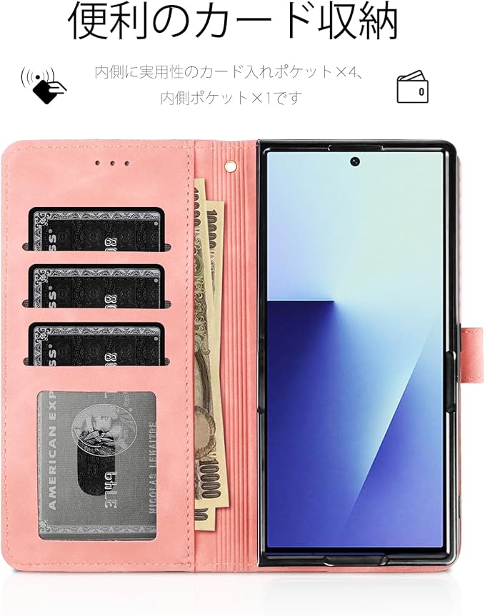 【カード収納とスタンド機能】:Samsung Galaxy Z Fold 7 財布型 カバーの内側に実用性のカード入れポケット 3、内側ポケット 1、カード類、現金、名刺、免許証入れなどを収納でき、通勤も通学にも楽々タイプです 。Galaxy Z Fold7 ケースはブラケット機能が付いており、好きな角度に合わせて動画を見たり読んだりして、両手が解放さ、優れた利便性、長時間での新幹線、飛行機の中での暇つぶしに最適ですよね。