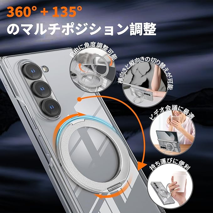【革新的なヒンジスタンド】ギャラクシー Z Fold7 ケース高解像度の透明PC素材で作られており、携帯電話の美観を損なうことなくぴったりとフィットします。巧妙なヒンジ機構により、瞬時に安定したスタンドに折りたたむことができ、臨場感あふれる視野角でビンジウォッチングを楽しんだり、画面を立ててハンズフリー作業を行うこともできます。360 +135 の調整機能により、横向きと縦向きの切り替えが可能で、ビンジウォッチング、ビデオ会議、電子書籍の閲覧など、携帯電話をより効率的に使用できます。