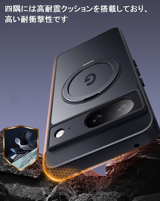 【落下防止】スマホの画面やカメラレンズの落下による損傷を保護するために、レンズやエッジよりも少し高いデザインを採用します。四隅には高耐震クッションを搭載しており、高い耐衝撃性です。全方位からしっかりと守ります。