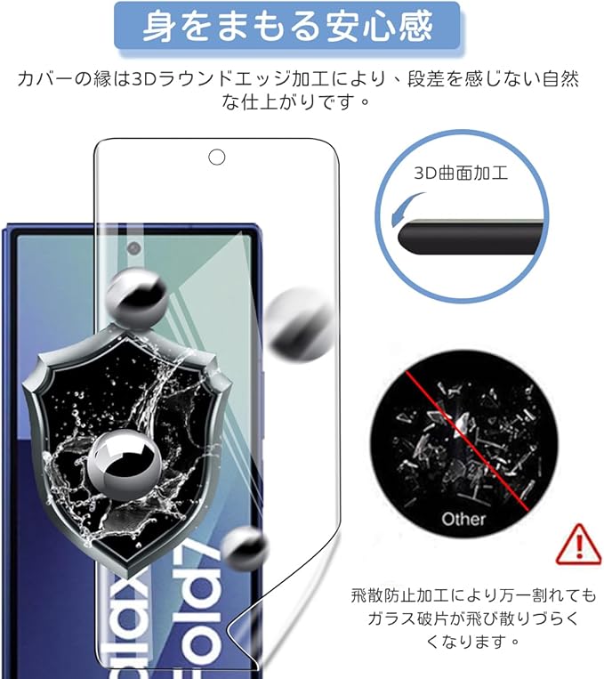 【全面保護】TPU素材特有の弾力性と柔軟性により、端末のラウンド部分までしっかり全面保護する事ができます。エッジの曲面までしっかりカードで安心できます。TPUフィルムは、耐久性、耐油性、耐酸性にも優れています。落下や衝撃などでスクリーンが割れなくてしっかり守れます。