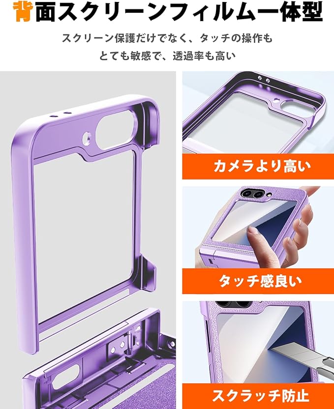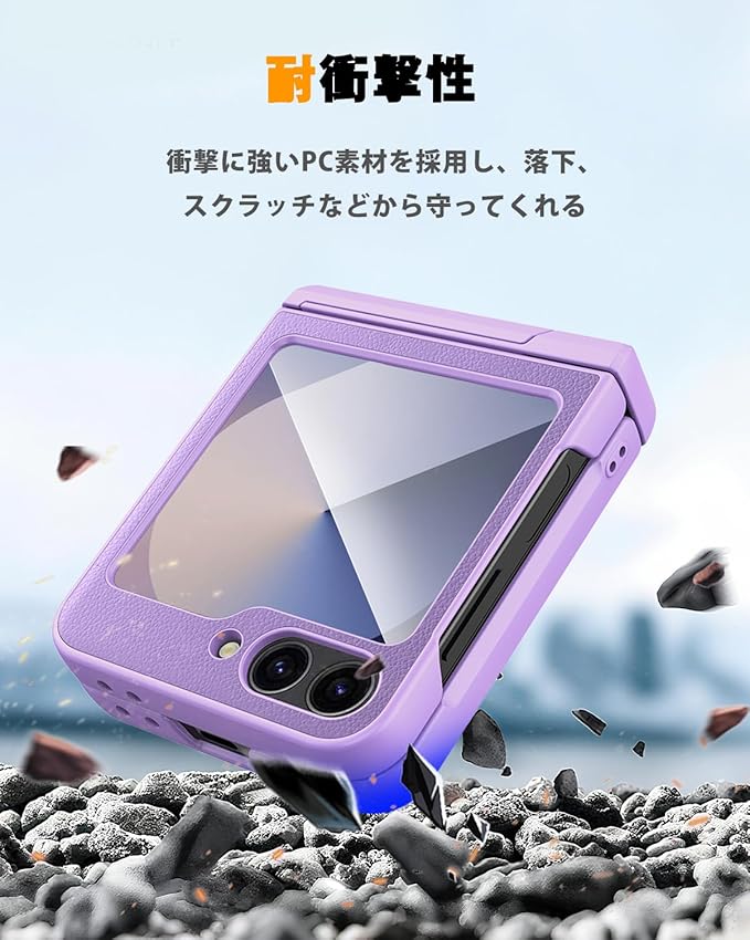 NINKI適応galaxy z フリップ7 ケース [SC-55F|SCG35] スタンド機能付き ヒンジ保護 PC+PU素材 レディース 女性対応 純正 指紋つけにくい 折り畳み式 液晶保護フィルム付き 耐衝撃 ピッタリ対応 人気 ライチ柄 galaxy z flip7 5gケース (パープル)