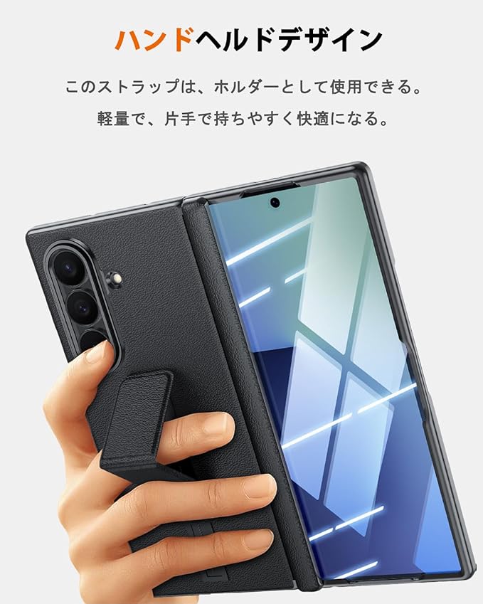 【リストバンド付き・本革】NINKI適応Galaxy Z Fold 7 ケース [SC-56F|SCG34] ハンドバンド スライド式スタンド機能 磁気付きのヒンジ フィルム一体型 PC+レザー製 ストラップ 画面保護 耐衝撃 ケーブル充電対応 サムスン ギャラクシー フォールド 7 スマホ ケース (ブラック)