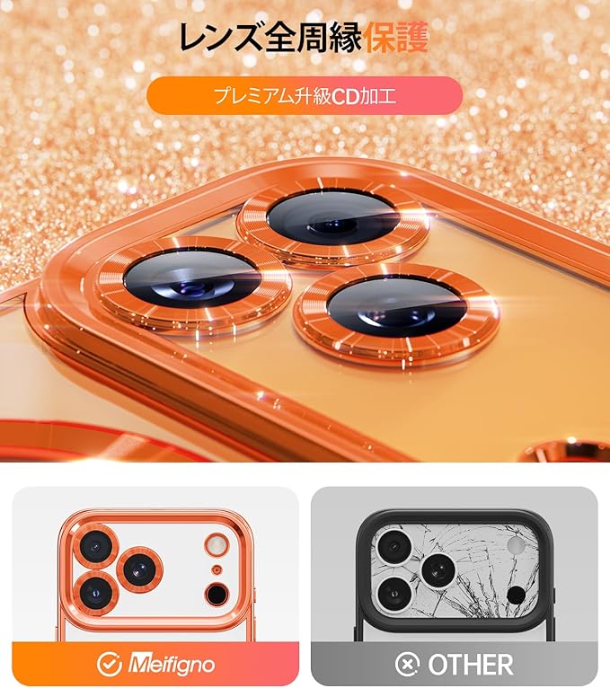 Meifigno マグネット式ケース 取り外し可能なスマホリングスタンド付き iPhone 17 Pro Max 6.9インチ用 [グリッターカード&リストストラップ] [MagSafe対応] [ミラー内蔵] マグネット式スマホリングホルダー + ケースキット、オレンジ