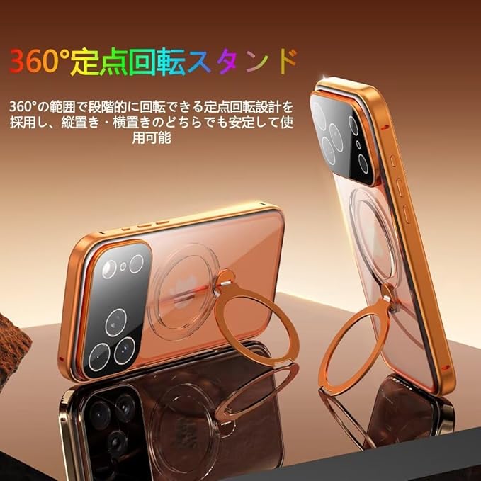 多機能360 定点回転スタンド:背面に搭載された360 定点回転スタンド付きスマホリングは、高品質アルミ合金素材を採用し、金属光沢が際立ち、高級感あふれる仕上がりです。縦置き・横置きの両方に対応し、ケースを開くだけでスタンドとして使用可能。指に掛ければリングとして落下防止にも活躍し、外出時に別途スタンドやリングを持ち歩く必要はありません。使用しないときは背面にすっきり収納できます。