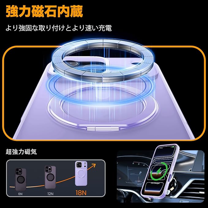 【MagSafe対応】iphone17 pro maxの代替品 magsafe対応ケースは、背面に薄くて強力なマグネットを内蔵しており、ワイヤレス充電や車載ホルダー、アクセサリーとの安定した接続が可能です。差し込む必要がなく、より簡単かつ迅速に充電できます。
