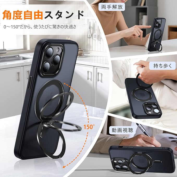 iPhone 14 Pro Max 用 ケース Magsafe対応 360 回転スタンド アイフォン14プロマックス 携帯ケース リング マグネット ワイヤレス充電 縦横多角度 対応 カバー Uovon アイホン14プロマックス スマホケース 車載ホルダー ストラップ穴付き マット 半透明 指紋防止 黄变防止 金属ボタン 米軍MIL規格 ・ ブラック