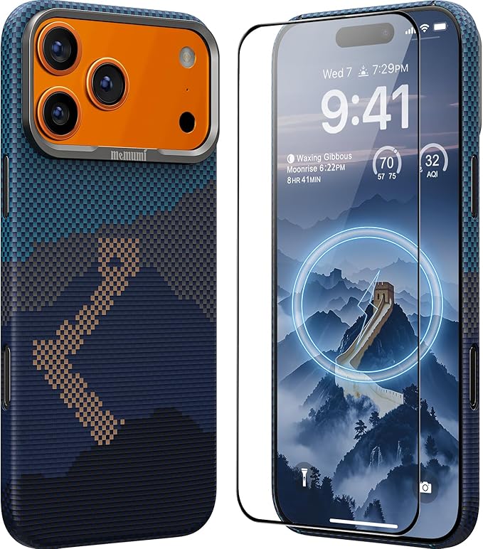 「memumi」マグネット搭載アラミド繊維ケース iPhone 17 Pro Max用の耐衝撃保護カバー1500Dアラミド繊維浮き織り[強化ガラスフィルム付き] ワイヤレス充電対応 ミニマリスト シンプル