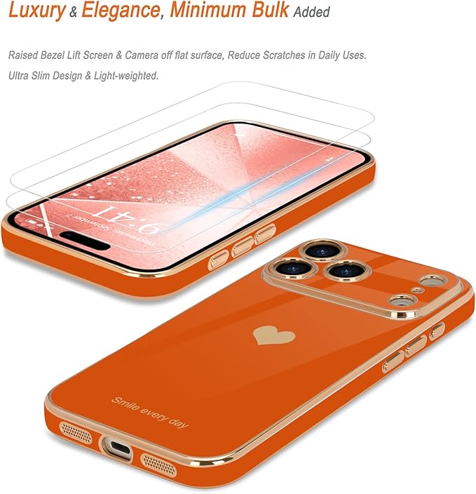 Teageo iPhone 17 Pro Max 用 ケース 【1枚ケース+2枚ガラスフィルム】 全面保護 女の子 可愛い おしゃれ ハート スマホケース 薄型 耐衝撃 落下防止 メッキ加工 アイフォン 17 Pro Max 適用 保護カバー(オレンジ)
