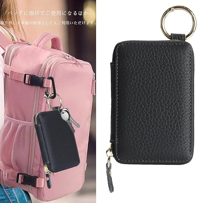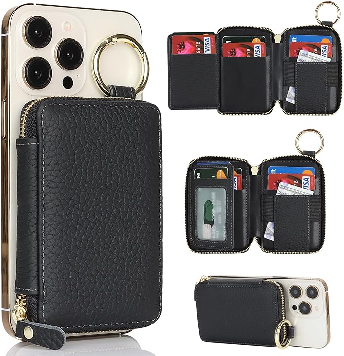 Cavor MagSafe カード入れ 本革 手帳型 財布型スタンド機能 ジッパーMagSafe 小銭入れ iPhoneカードケース 小銭入れ MagSafeスタンド カード収納 落下防止 キーリング付き 取り外し可能 for iPhone 17 Pro Max/17 Pro/Air/17、iPhone 16/15/14/13/12に対応(iPhone 16eは対応していません)-ブラック
