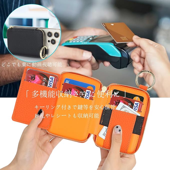 【収納機能】①ファスナー式の小銭入れ、窓口式のカード入れ、カードスロット複数付き、それにピタッと閉じるマグネット式の留め具とスナップ式のプリップにより、大事なカードたちを完全に保護します。②カード、建物、地下鉄またはその他の交通機関へのアクセスのために定期的にカードをスワイプする人に最適です、加えて精巧なファスナーデザイン :もっと安心してカードや現金を携帯のケースに入れて、安全で便利です。