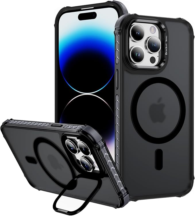 iPhone 14 Pro Max 用 ケース MagSafe対応 耐衝撃保護 金属製カメラスタンドとメタルボタン付き プロテクターカバー (ブラック)