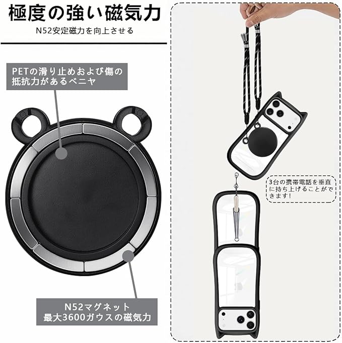 iPhone 17 pro max/アイフォン17 pro max ケース お使いの携帯電話のすべての機能、ポート、ボタンに簡単にアクセスできます。この携帯ストラップは3way使い方で、首掛けやショルダーに斜め掛けでき、アームにぐるぐると巻いても可能です。旅行中の写真撮りやバイクの上のスマホ通話時、手から落下することなどはもう心配要らない!約4KGまでの荷重に耐える強力磁力です。iPhone 16/15/14/13シリーズをしっかりと吸着できます。マグネット式スマホリングで、iPhone MagSafe シリーズ本体やMagSafe搭載ケースに簡単に装着できます。便利な両面マグネットで、冷蔵庫、洗濯機、ジムの設備などに貼り付けます。両手が解放され、様々なシーンで大活躍!仕事しながらビデオ会議やビデオチャットをすることができます、Tiktok、YouTube、INSなどを楽しめます。通常のストラップよりも快適で実用的です。 作業、旅行、出張、ショピング、散歩、コンサート、パーティーに最適です。