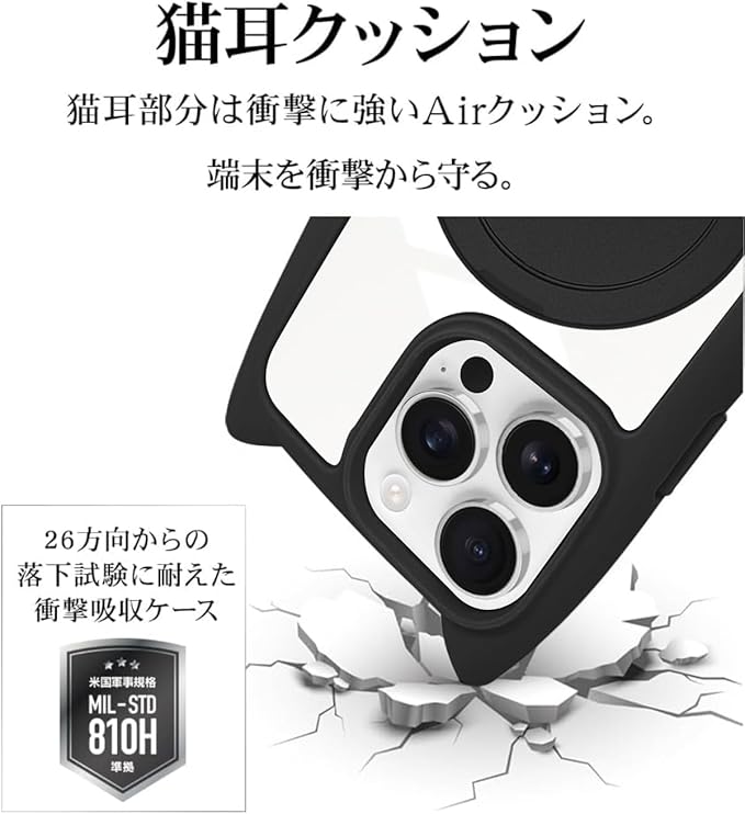 iPhone 14 Pro Max 専用 ケース クリア カバー ハイブリッド 猫耳 ネコミミ 背面ガラス クリア かわいい おしゃれ ストラップホール アイフォン 14 Pro Max スマホケース 多機能 全面保護 落下防止(ブラック)