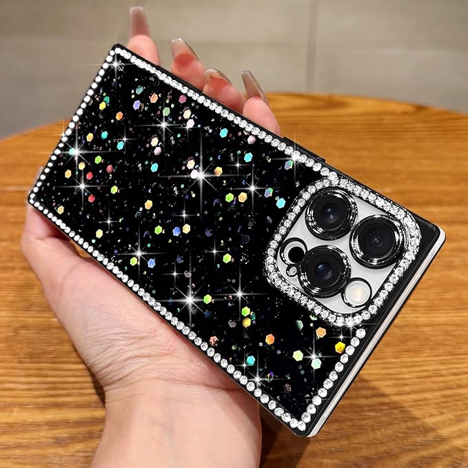 LAPOPNUT iPhone 14 Pro Max 用 ケース キラキラ ラメ ラインストーン おしゃれ スマホケース 長方形 直線エッジ 人気 可愛い 耐衝撃 落下防止 軽量 落下保護 衝撃吸収 カバー 携帯ケース(ブラック)