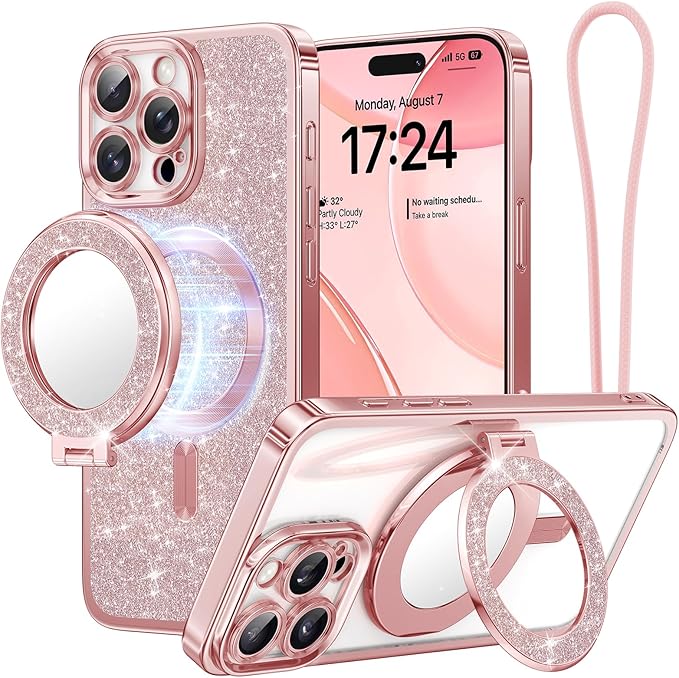Meifigno マグネット式ケース 取り外し可能なスマホリングスタンド付き iPhone 16 Pro Max 6.9インチ用 [グリッターカード&リストストラップ] [MagSafe対応] [ミラー内蔵] マグネット式スマホリングホルダー + ケースキット、ローズゴールド