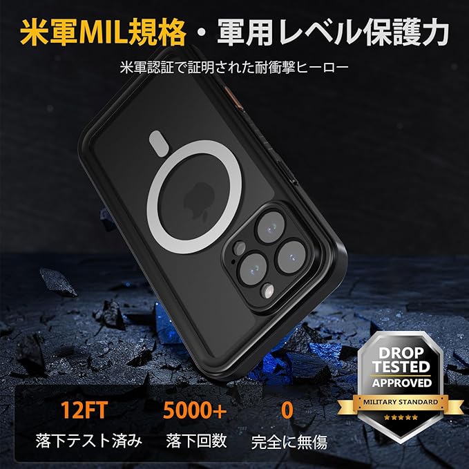 【防水・米軍基準・MagSafe対応】UMITTOS iPhone 16 Pro Max 用 ケース 防水 衝撃吸収 水中撮影対応 Qi充電対応 顔認証対応 全面保護 完全防水 防雪 防塵 滑り止め 手持ちやすい 頑丈 耐衝撃 ストラップ付き 雨の日、お風呂など適用 防水ケース(6.9インチ)
