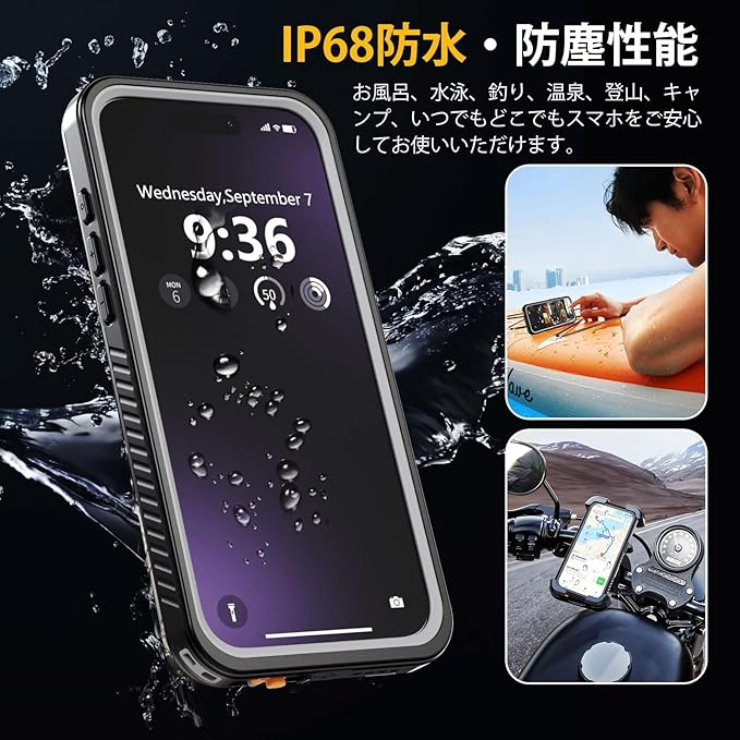 【IP68防水認証取得】iPhone 16 Pro Max 専用の完全防水防塵ケースです。最高防水レベルのIP68認証を取得し、水深さ2Mの水中に1時間まで水没でき、さらに水中撮影でも対応出来ます。防水機能だけでなく、砂・ホコリ・ゴミなどの侵入も防ぎますので、お風呂、水泳、釣り、温泉、登山、キャンプ、いつでもどこでもスマホをご安心してお使いいただけます。