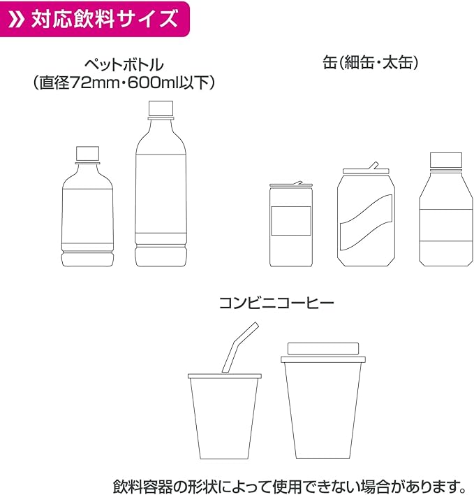 対応飲料サイズ:ペットボトル・太缶・細缶(最大:直径72mm・600ml)