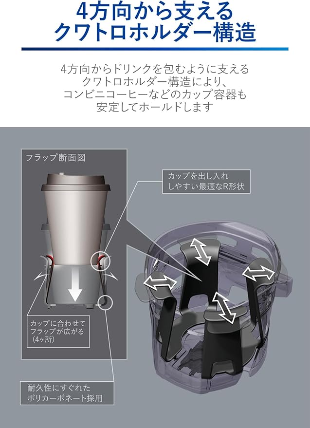 4方向からドリンクを包むように支えるクワトロホルダー構造により、従来のフラップ式のドリンクホルダーでは不安定になることが多かったコンビニコーヒーなどのカップタイプのドリンク容器も安定してホールドします。(当社従来品比)