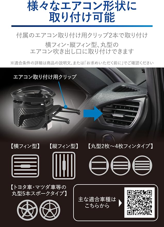 車のエアコン吹き出し口の形状が、横フィンタイプ、縦フィンタイプ、丸型エアコンタイプに取り付けできますが、条件によっては取り付けできない場合があります。