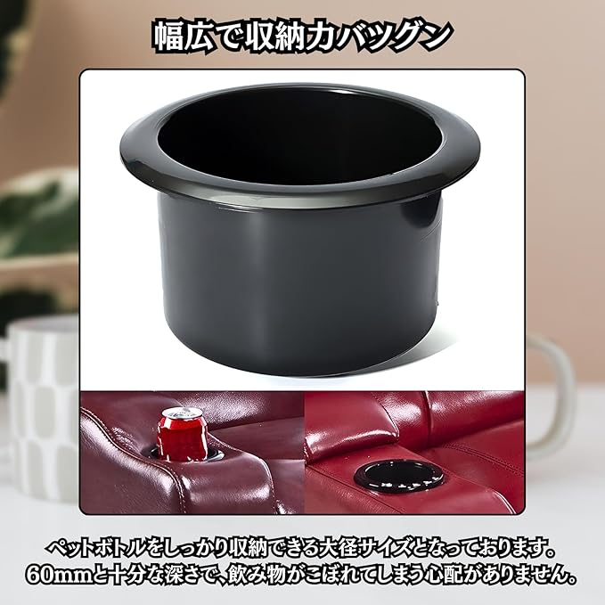 【DIY用カップホルダー】DIYで飲み物スペースを自作する際に役立つカップホルダーです。テーブルや肘置きにホールソーで穴を開けてはめ込むだけで、お手軽に飲み物スペースを増設できます。様々な箇所に設置できる複数セットでお届け!