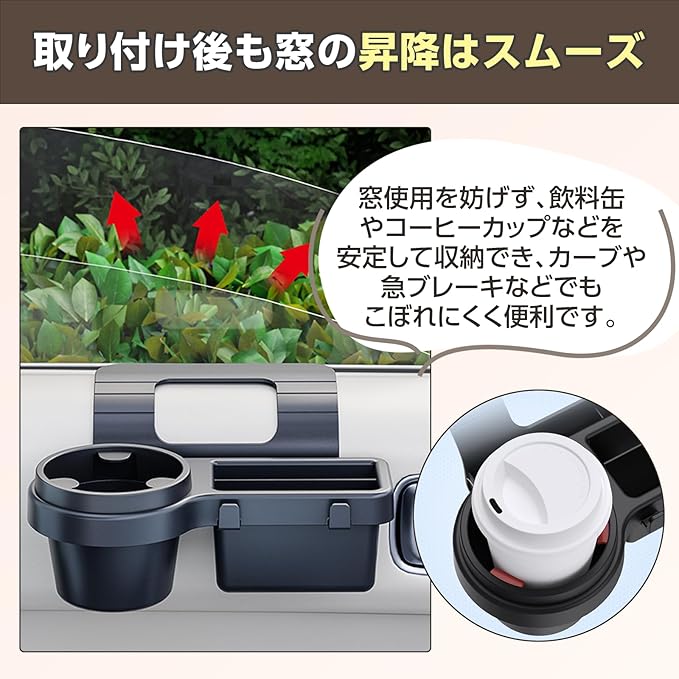 【窓の隙間に簡単取付のドリンクホルダー】2個セット。ドアの隙間に差し込むクリップ式で簡単装着。スマートフォンやキー、タバコなど小物を収納出来るドリンクホルダーです。