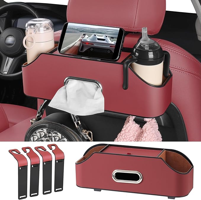 車载レザー製多機能後部座席・リアシート用ドリンクホルダー(ティッシュボックスとフック付き),ヘッドレストカップホルダー収納ボックス、車の旅行用収納用品 (赤色)