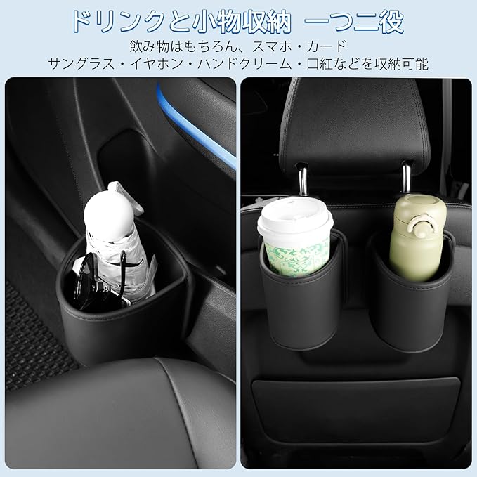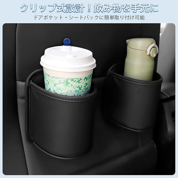 Catland ドリンクホルダー 車 後部座席 クリップ式 カップホルダー 増設 シートポケット ドアポケット対応 車用ドリンクホルダー 小物入れ 収納ボックス ゴミ箱兼用 車内グッズ PUレザー ブラック 2個セット