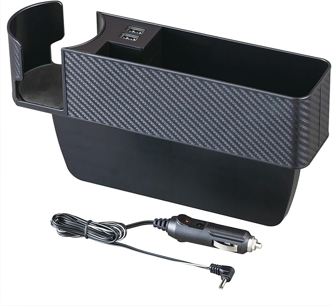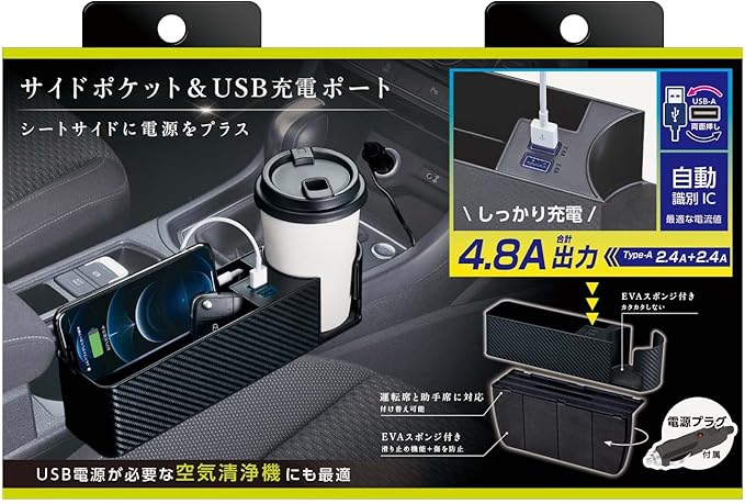 セイワ(SEIWA) 車内用品 シートサイドポケット USBポート付き 2口 ドリンクホルダー 収納 車用 カーボン WA82 シートオーガナイザー 4.8A出力 自動識別