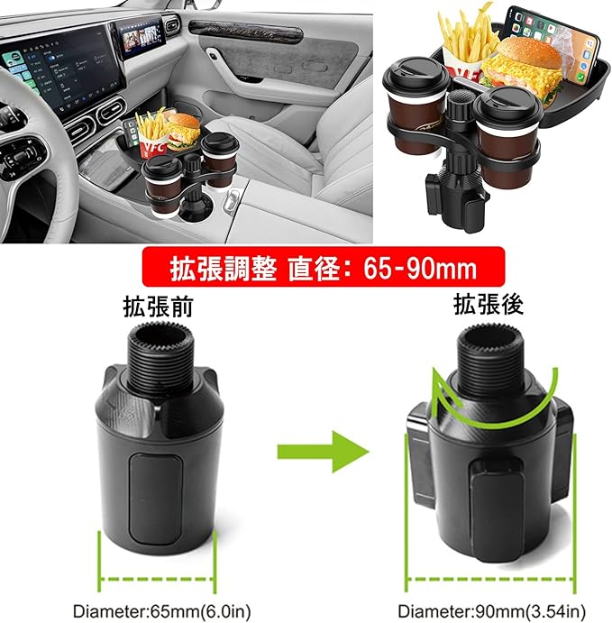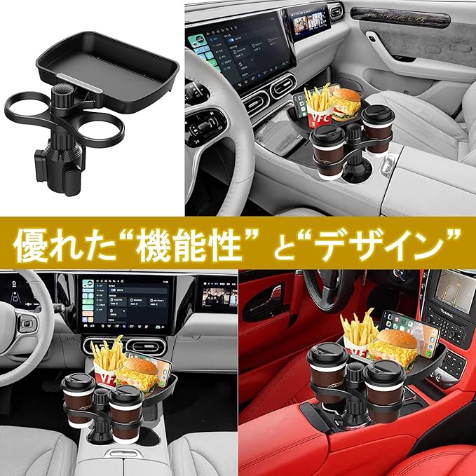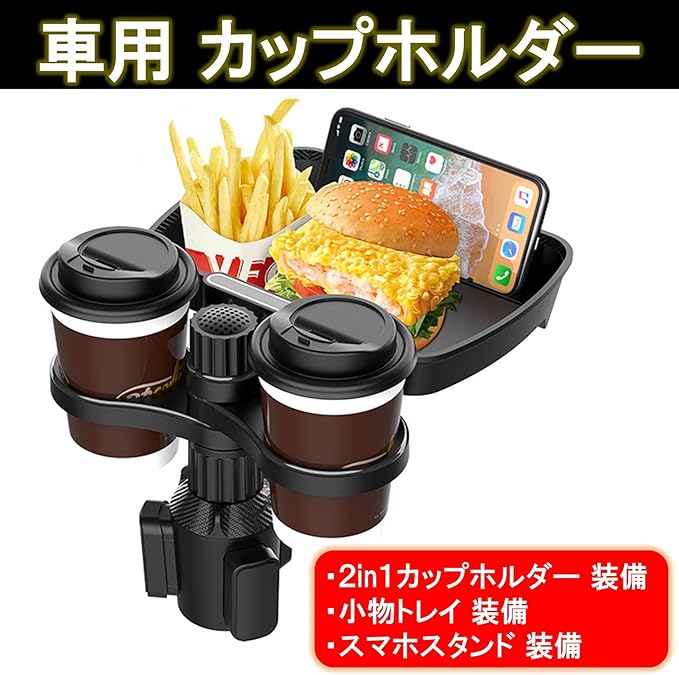 2-in-1車用カップホルダーです。2-IN-1省スペース設計で2つのドリンクカップ、小物やフードを置けるトレイが装備され、スマホも立て掛けられる多機能カップホルダーです。360 回転機能に手が届きやすい位置に調整可能です。直感的な作業性、能率的で車内スペースを有効活用できます。