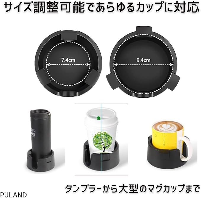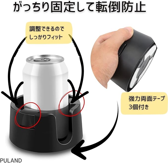 【調整可能であらゆるサイズに対応】ホルダー部分はスライド式で、ペットボトル、缶、タンブラーなど多様なサイズに対応します。飲み物の大きさに合わせて調節できるので、普段使いからオフィスや車内まで幅広く活躍します。