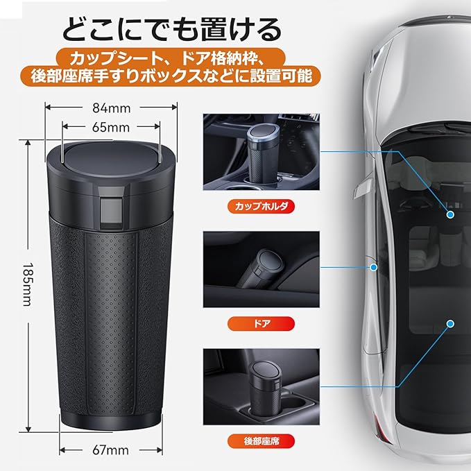 【抜群の安定性&転倒防止構造】 「カーブや急ブレーキで倒れた…」という経験に対応。自重178gの安定感+88mmスリムボディ設計により、車内のカップホルダーや隙間にしっかりフィット。波紋滑り止め底&360 回転ロックで振動にもズレにくく、ゴミの飛び散りゼロを実現します。