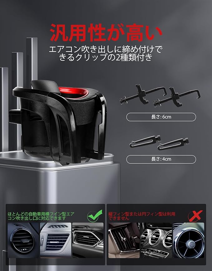 【取り付け簡単】ドリンクホルダーのスプリングは、あらゆる種類のカップに適しており小さなカップでも揺れません。 ①適合なクリップを選択する。②本体に両側のクリップを固定する。③エアコン吹き出し口に挿入する。④底のサポートを押し出す。