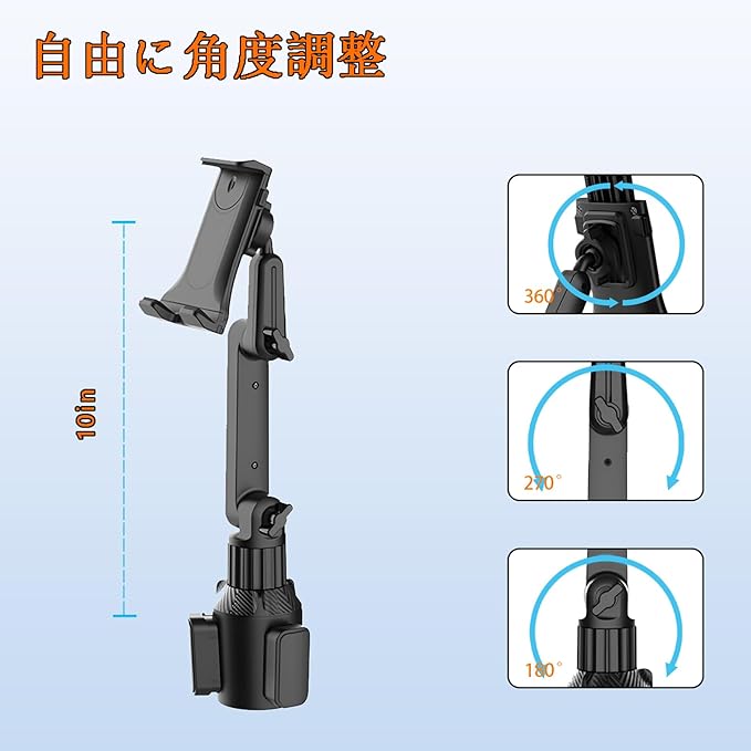 【自由に角度調整】このスタンドは、2つの調整可能なノブと180 のチルトレバーアームと360 のスイベルボールジョイントを備えています。アームは、ホルダーの回転、アームの角度、支柱の回転が可能です。カップホルダーに取り付けると、タブレットの画面を垂直モードまたは水平モードに簡単に調整して、最適な表示を実現できます。横でも縦でもスマホを自由に操作できます、両方使える動画鑑賞やナビゲートも見やすい。