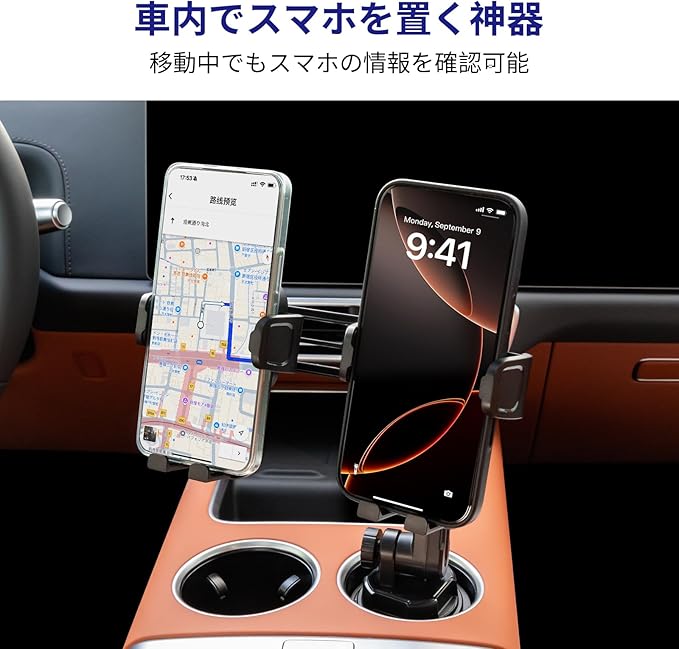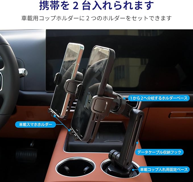 【1分2デザイン】カップホルダーひとつで二台のスマホを収納できます