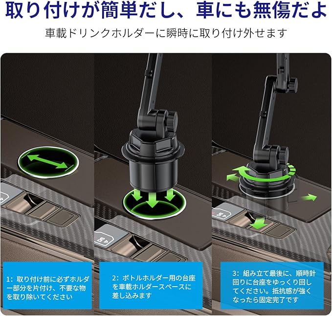特長:カップホルダーの場所を利用し、車体にダメージを与えません。